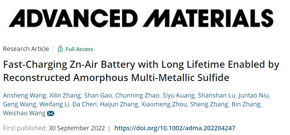 Wang, A., Zhang, X., Gao, S., Zhao, C., Kuang, S., Lu, S., Niu, J., Wang, G., Li, W., Chen, D., Zhang, H., Zhou, X., Zhang, S., Zhang, B. and Wang, W. (2022), Fast-Charging Zn-Air Battery with Long Lifetime Enabled by Reconstructed Amorphous Multi-Metallic Sulfide. Adv. Mater.. Accepted Author Manuscript 2204247.