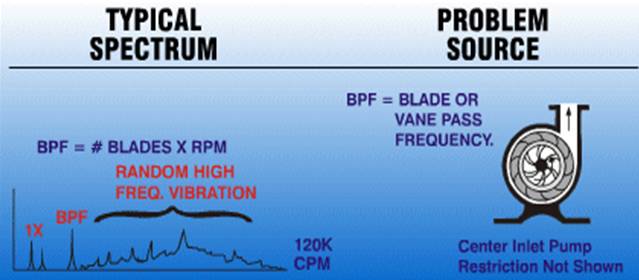 回流频谱与气蚀频谱非常相似,也有随机宽带振动,有时还有叶片通过频率。