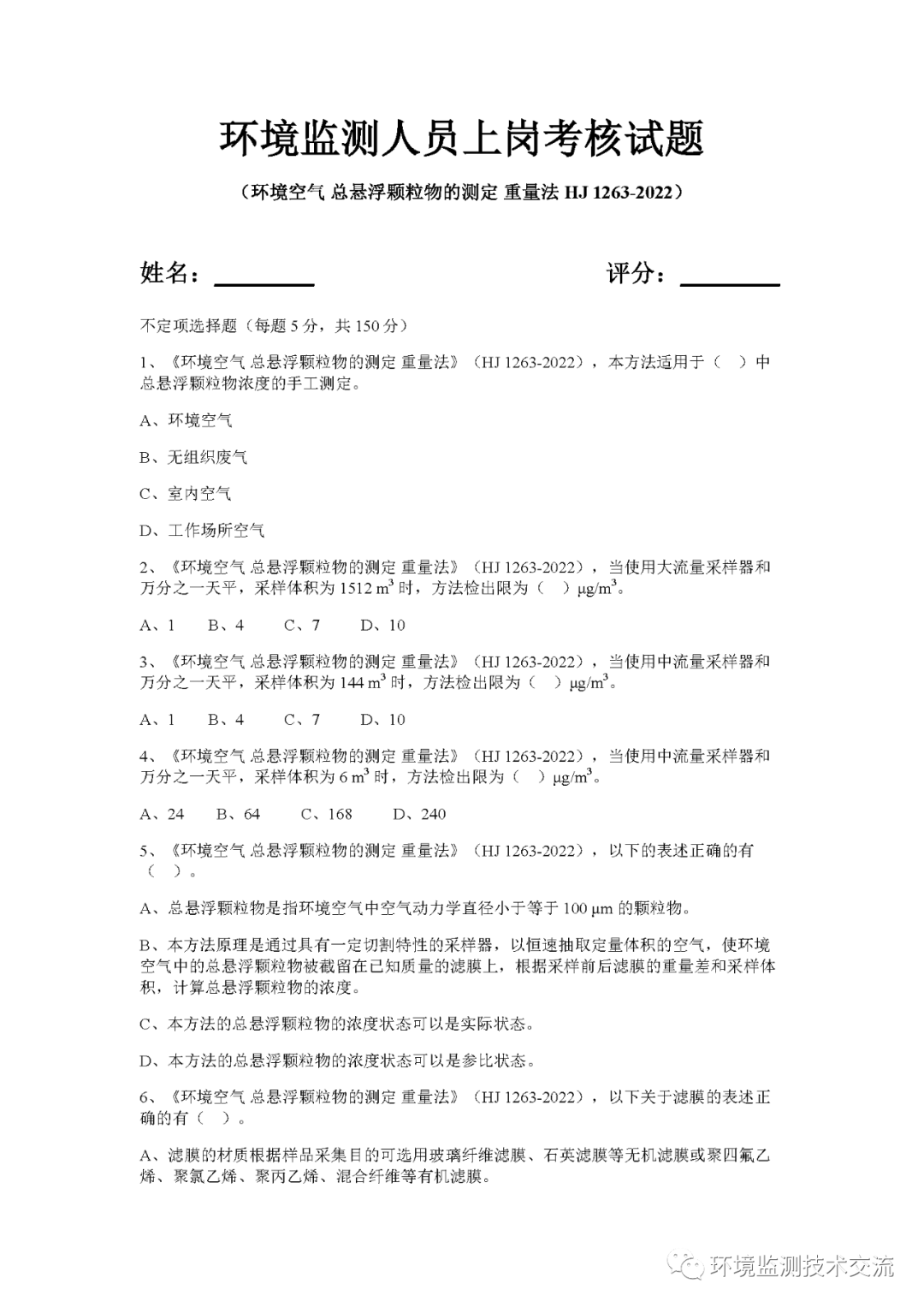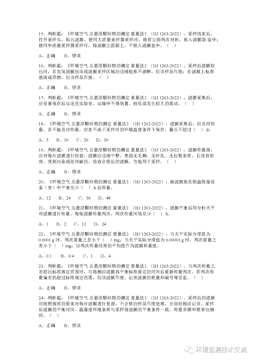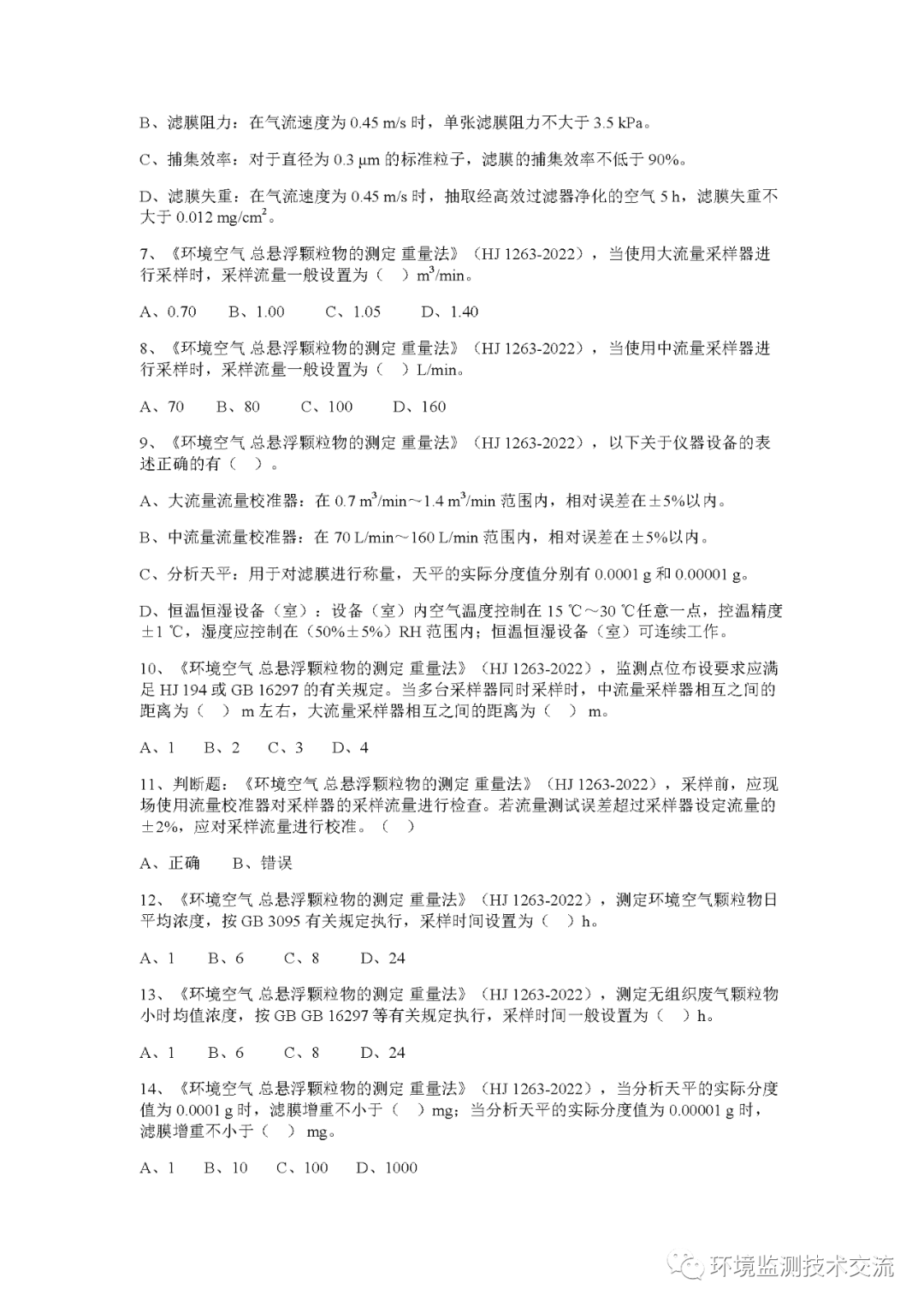 【付费阅读】环境监测人员上岗考核试题(环境空气 总悬浮颗粒物的测定 重量法HJ 1263-2022)