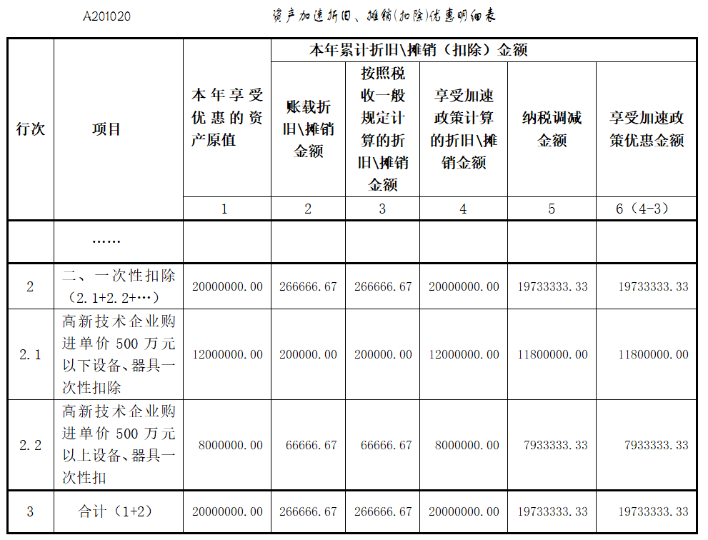 (十六)我公司是一家高新技术企业,按季度预缴企业所得税。2022年11月将购入设备2000万元,12月投入使用并开始计提折旧。其中,单价500万元以下设备1200万元,均按5年计提折旧;单价500万元以上设备800万元,均按10年计提折旧。税收最低折旧年限与会计折旧年限相同,预计净残值为0,2022年其余月份未购入固定资产。第四季度预缴申报时,如何填写申报表?