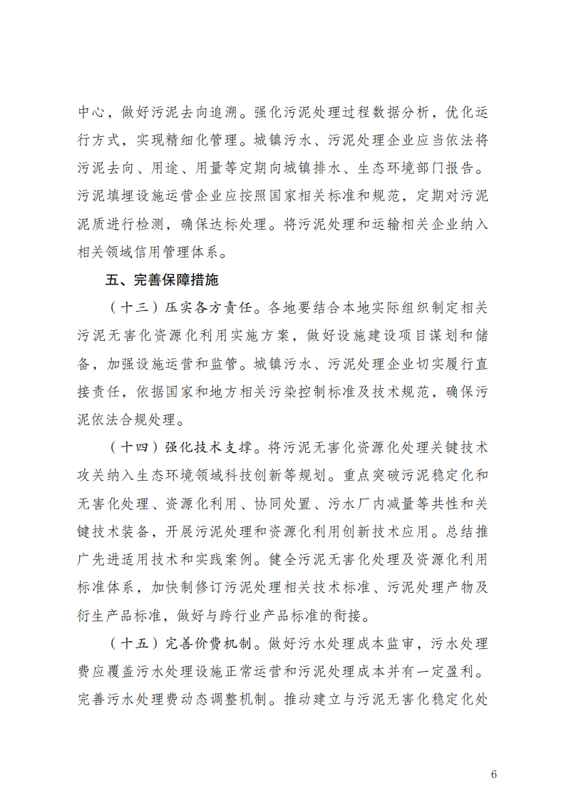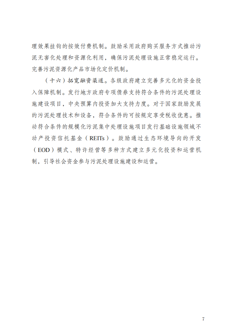 《实施方案》强调,完善政策措施,保障各项工作落地见效。一是压实各方责任。各地结合实际制定实施方案并依法履行监管责任,相关企业切实履行直接责任确保污泥依法合规处理。二是强化技术支撑。加快关键技术攻关,推广先进适用技术,健全标准体系。三是完善价费机制。健全污水处理费动态调整机制,推动建立与污泥无害化稳定化处理效果挂钩的按效付费机制,鼓励政府购买服务。四是拓宽融资渠道。建立完善多元化的资金投入保障机制,鼓励发行地方政府专项债券、基础设施领域不动产投资信托基金(REITs)等方式支持符合条件的污泥处理设施项目,中央预算内投资加大支持力度,积极引导社会资金参与污泥处理设施建设和运营。