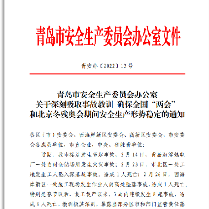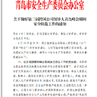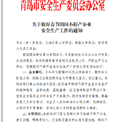 突出重点做好安全防范。 紧盯“两节、两奥、三会”、停产复工、清明、五一、汛期、跨国公司领导人青岛峰会、国庆、党的二十大等特殊敏感时期,市安委办提前下发安全防范通知,召开全市性安全生产会议,分析形势、通报情况、部署工作。针对今年以来的事故特点,先后组织开展了涉爆粉尘、危险化学品、仓储场所、海上安全、燃气安全、涉氨制冷等专项整治,做好重点防范。春节期间全面摸排1857家不停产企业并建立台账,实行网格化监管和领导干部包联企业制度。