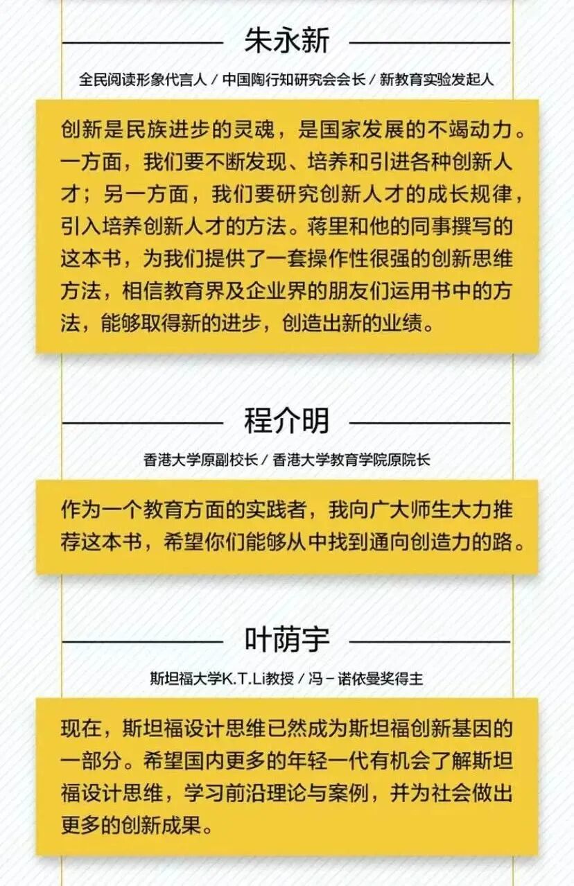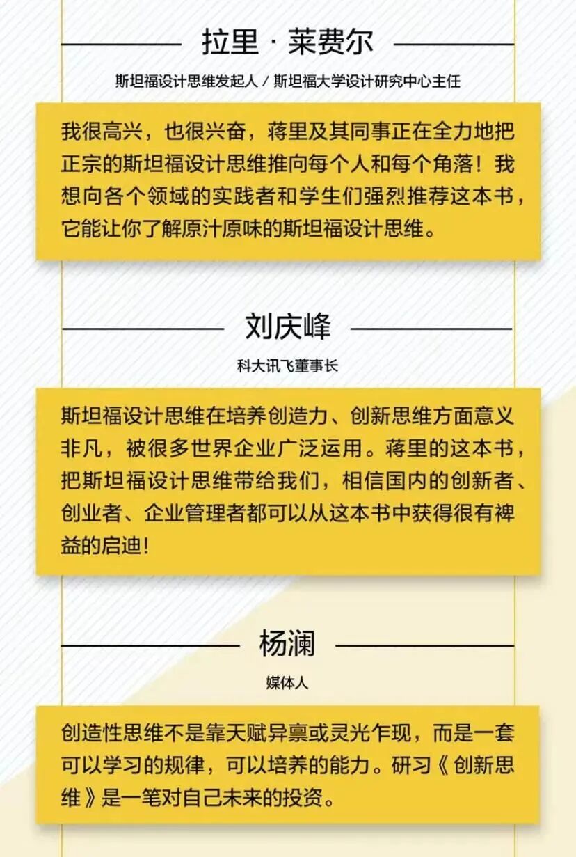 这本《创新思维:斯坦福设计思维方法与工具》,把原汁原味的斯坦福设计思维带给大家,并让大家看看在斯坦福大学全球创新设计联盟*内部,是如何给研究生上设计思维课程的。 (*斯坦福大学全球创新设计联盟:来自20多个国家的近30所顶尖高校和全球过百家企业共同创立了斯坦福大学全球创新设计联盟。这是一个致力于推广斯坦福设计思维的国际性联盟,也是世界上最大的推广斯坦福设计思维的国际性联盟。)
