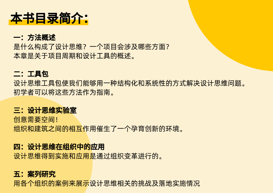 本书围绕设计思维的 方法、工具、应用、案例、研究 这五个方面,从理论到实践、从方法到工具,既提是什么又提为什么,既讲怎么看又讲怎么办,对设计思维进行了深入浅出的诠释,告诉我们设计思维如何使创造力、创新力的教授变得有规律可循,成为可传授的内容。