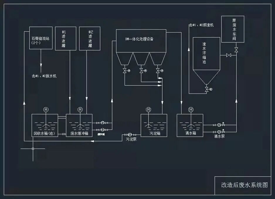 常规设计的脱硫废水系统,使用废水给料泵将回收水箱的石膏浆液送至废水旋流站,废水旋流站溢流进入中和、沉降、絮凝三联箱,然后进入澄清器和出水箱,最后合格废水外排,澄清器的污泥经污泥输送泵排往板框压滤机,泥饼外运。
