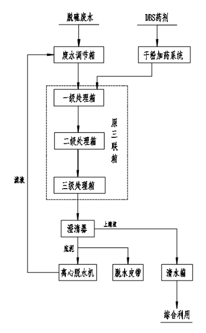 废水经由废水提升泵送入一级反应箱,随后依次经过二、三级箱。同时DBS处理剂从二级处理箱顶部的自动加药系统投入,复合处理剂的投入量可以通过变频器调节。复合处理剂投入量根据脱硫废水进水量及水质情况通过给药机的变频投药装置自动调节,再由二级处理箱溢流至三级处理箱。二、三级处理箱搅拌的主要目的是促成较大矾花的形成。处理过的废水溢流进入原澄清器,经过澄清器,水中的矾花会沉降下来,然后排出清水。