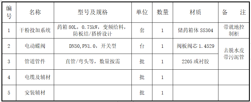 新增一套自动加药系统。固体粉末经加药箱自动给料器投入,在搅拌机的搅拌作用下,与脱硫废水均匀混合。复合处理剂的投入量可以通过变频器调节。