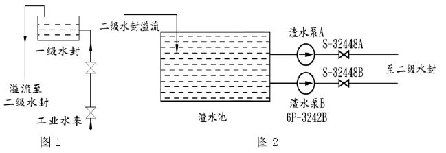 (3) 二级水封通过渣水循环泵将渣水池内水打回二级水封,从而保持二级水封水的连续溢流状态,并将渣水循环泵增设低液位保护,保证渣水循环泵的运行安全性。