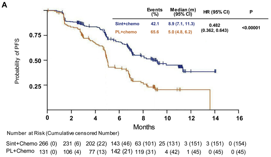 根据ORIENT-1试验结果,达伯舒联合化疗组的中位无进展生存时间