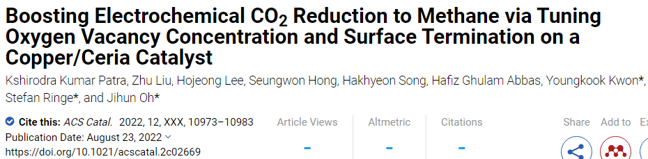 Kshirodra Kumar Patra, Zhu Liu, Hojeong Lee, Seungwon Hong, Hakhyeon Song, Hafiz Ghulam Abbas, Youngkook Kwon, Stefan Ringe, and Jihun Oh. Boosting Electrochemical CO 2 Reduction to Methane via Tuning Oxygen Vacancy Concentration and Surface Termination on a Copper/Ceria Catalyst. ACS Catal. 2022, 12, XXX, 10973–10983