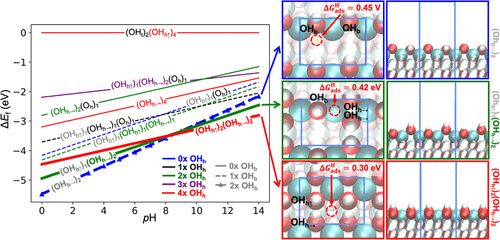 接下来,我们使用DFT + U公式中的 DFT计算,构建了一个完整的Pourbaix稳定性图,作为相关应用电位下的pH函数。我们注意到,特别是在(110)情况下,在去除氢氧化物和氢原子后,表面刻面基本上被重建。如图 6 所示的(110)晶面,三个最稳定的晶面包含一个氢氧根末端位点,根据pH值,较低的桥位点占据不同的位置。我们还在三个最稳定的曲线上包括自由能和溶剂化校正,以测试转变的有效性。正如支持信息中进一步描述的那样,这些修正只是改变了pH过渡区域,但并没有从本质上改变趋势。