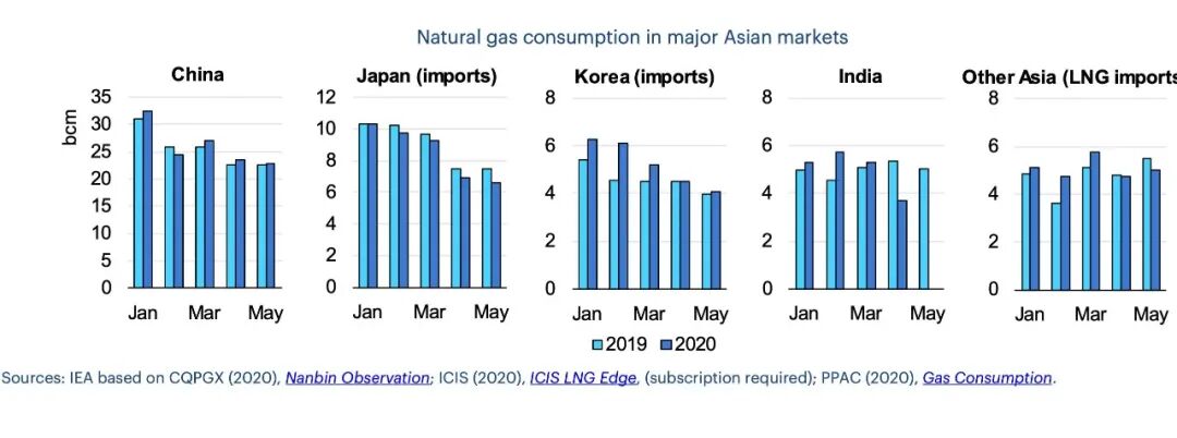 亚洲主要天然气市场消费量2019-2020年1-5月对比图