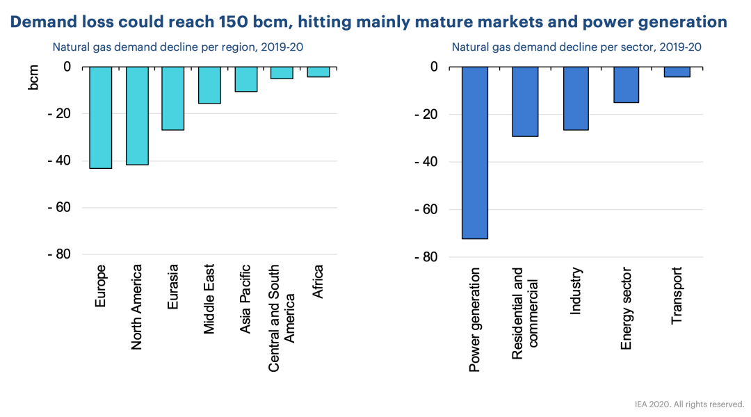 2020年需求下降约为1500亿立方米,主要来自欧洲和北美市场及发电行业