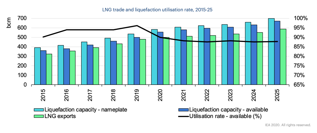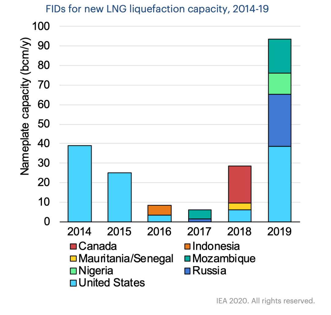 国际能源署表示,近年来做出的LNG项目最终投资决定,将会使2020年至2025年期间每年新增至多1.2亿立方米的LNG产能,或约1.63亿吨。2019年是LNG新项目投资创纪录的一个年份,新的最终投资决定 (FID)带来的新增产能约为950亿立方米。