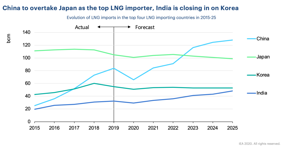 对于印度,由于国家制定了政策目标要将天然气在能源结构中的占比从6%提高到15%,以及液化天然气和管道基础设施的改善,国际能源署预计在2019-2025年间,印度每年的需求会增加280亿立方米。工业用气的需求被视为印度LNG需求增长的主要推动力。