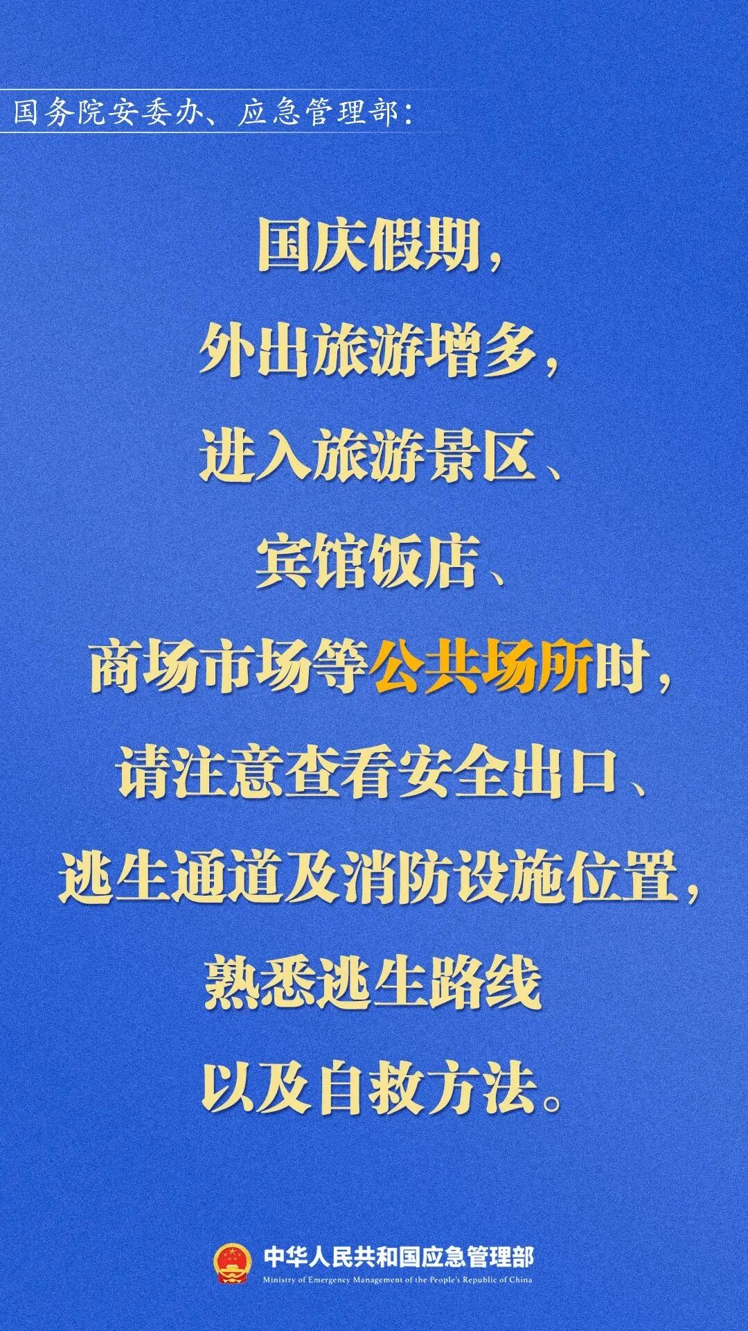 会议指出,今年国庆假期安全形势十分严峻复杂,高危领域风险突出,公共安全隐患点多面广,季节性风险逐步凸显,自然灾害风险不容忽视,特别是近期接连发生重大事故,暴露出一些地方安全生产还存在许多薄弱环节。必须始终保持清醒头脑,增强风险意识,坚持底线思维,全力以赴落实各项风险防控措施,坚决稳住安全形势。 要 以高度的政治责任感狠抓工作落实。各级应急管理部门要以“时时放心不下”的责任感,全力推动党中央、国务院决策部署落实落地,在抓好矿山、危化、消防、工贸等行业领域的基础上,当好党委政府的参谋助手,有针对性地提出对策建议,特别是对重大隐患一定要紧盯不放、一抓到底,确保整改销号。 要 采取超常规措施防控重大风险隐患。消防领域要组织力量对大型综合体、高层建筑、餐饮场所、商场市场、旅游景区等人员密集场所进行全面深入排查,突出餐饮场所闭锁逃生通道、防盗网和广告牌阻塞出口等,及时消除重大火灾隐患。矿山、危化、烟花爆竹、工贸等高危领域要督促企业主要负责人和技术管理团队在岗在位,对储存设施、装备等重大危险源落实包保责任制,对风险大、隐患多的厂矿派人现场盯守。推动有关部门对交通、旅游、建筑、渔船、燃气、特种设备等行业领域采取管用有效的措施,坚决把风险防控住。 要 依法严厉打击各类违法违规行为。保持打非治违力度不减,下沉监管执法力量,发动群众举报,严肃查处矿山盗采资源、公共场所锁闭安全出口、危化违规动火等严重违法行为。同时,要依法行政、依法监管,自觉接受监督,处理好监督与服务的关系,既要严格监管、也要热情服务,帮助企业解决实际困难和问题,支持经济社会发展大局,以高水平安全促进高质量发展。全系统要加强行风建设,树立良好的社会形象。