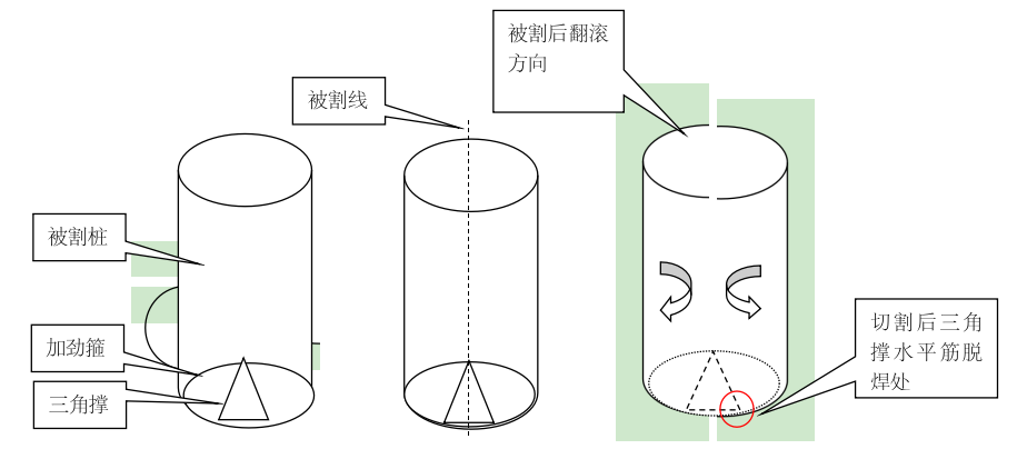 当桩芯混凝土被从中间对半凿开后,裂开的半圆形桩头在重力作用下向南北方向翻滚,导致北侧桩头外露的加劲箍筋和三角撑钢筋脱焊分开。