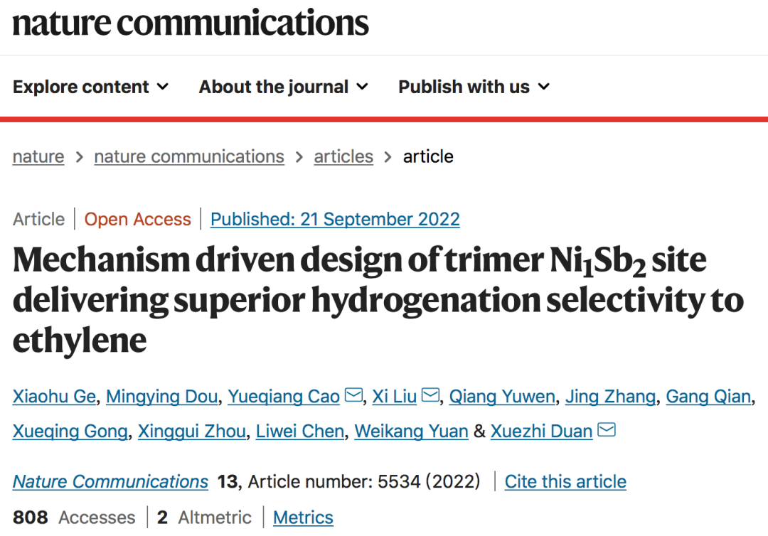 Nature Commun.:三聚体Ni1Sb2位点高选择性乙烯加氢