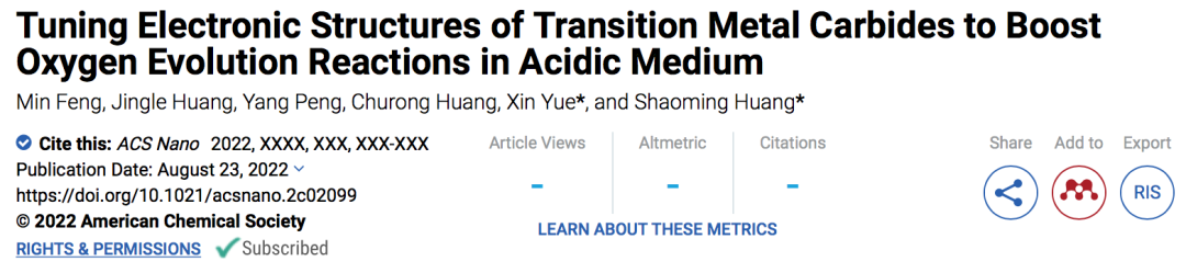 Min Feng, Jingle Huang, Yang Peng, Churong Huang, Xin Yue*, and Shaoming Huang. Tuning Electronic Structures of Transition Metal Carbides to Boost Oxygen Evolution Reactions in Acidic Medium. ACS Nano 2022,