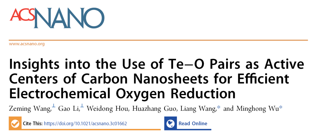 在环境电催化氧还原取得重要进展。相关成果以“Insights into the Use of Te-O Pairs as Active Centers of Carbon Nanosheets for Efficient Electrochemical Oxygen Reduction”发表在纳米科技领域国际顶级期刊《ACS Nano》(JCR和中科院一区Top,影响因子为18.027),