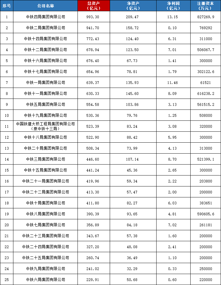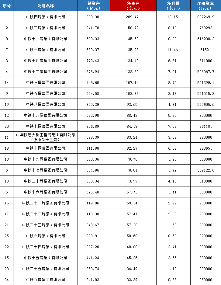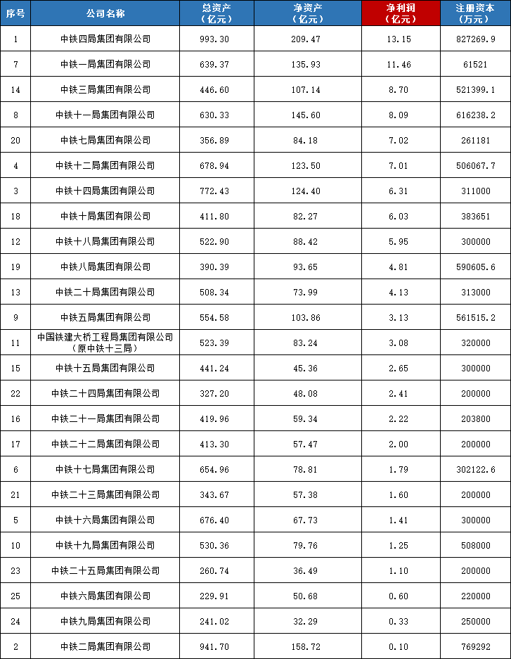 中铁二局、中铁六局、中铁九局 净利润未超过1亿元 ,排名比较靠后。