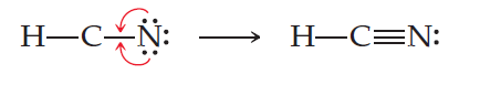 这两个键占四个电子。H 原子只能有两个与之关联的电子,因此我们不会再向它添加任何电子。如果我们将剩余的六个电子放在 N 周围给它一个8电子稳定结构,我们不会在 C 上实现一个8电子稳定结构:
