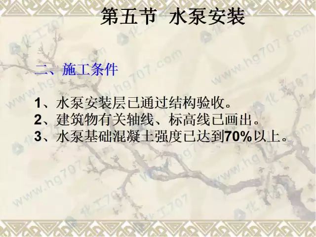 2)水泵基础表面和地脚螺栓预留孔中的油污、碎石、泥土、积水等应清除干净;预埋地脚螺栓的螺纹和螺母应保护完好;放置垫铁部位表面应凿平。