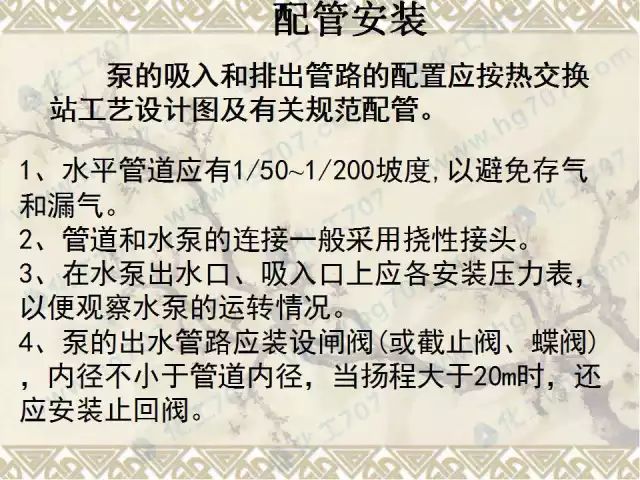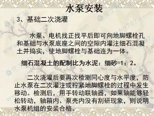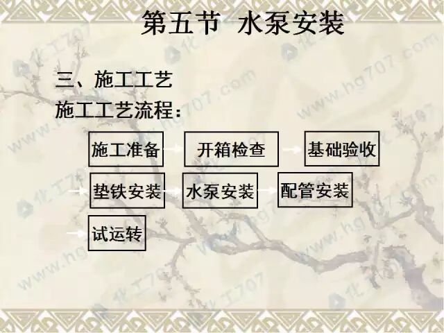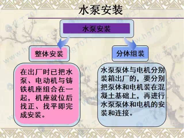 水泵安装流程:基础检验→水泵就位安装→检测与调整→润滑与加油→试运转