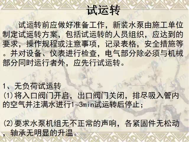 打开进水阀门、水泵排气阀,使水泵灌满水,将水泵出水管上阀门关闭。先点动水泵,检查有无异常、电动机的转向是否符合泵的转向要求。然后启动水泵,慢慢打开出水管上阀门,检查水泵运转情况、电机及轴承温升、压力表和真空表的指针数值、管道连接情况,应正常并符合设计要求。