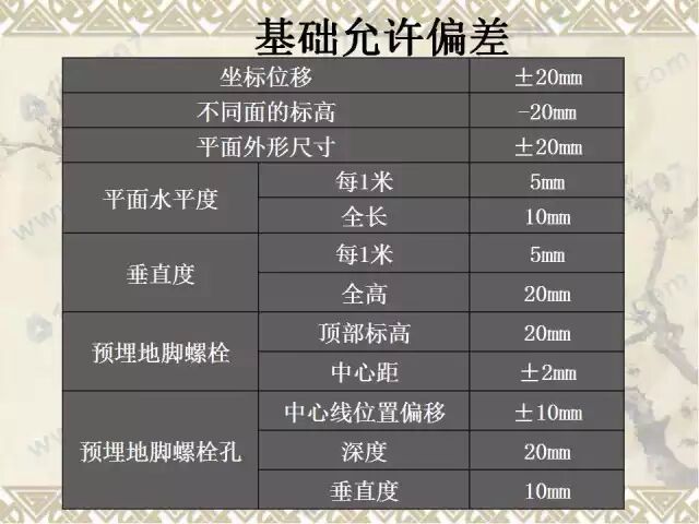 基础坐标、标高、尺寸、预留孔洞应符合设计要求。基础表面平整、混凝土强度达到设备安装要求。