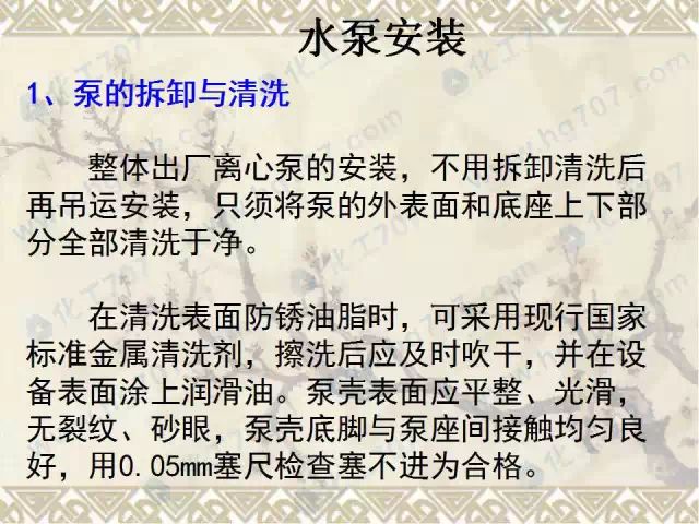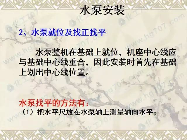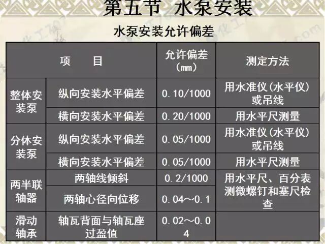 用水平仪和线坠在对水泵进出口法兰和底座加工面上进行测量与调整,对水泵进行精安 装,整体安装的水泵,卧式泵体水平度不应大于0.1/1000,立式泵体垂直度不应大于0.1/1000。