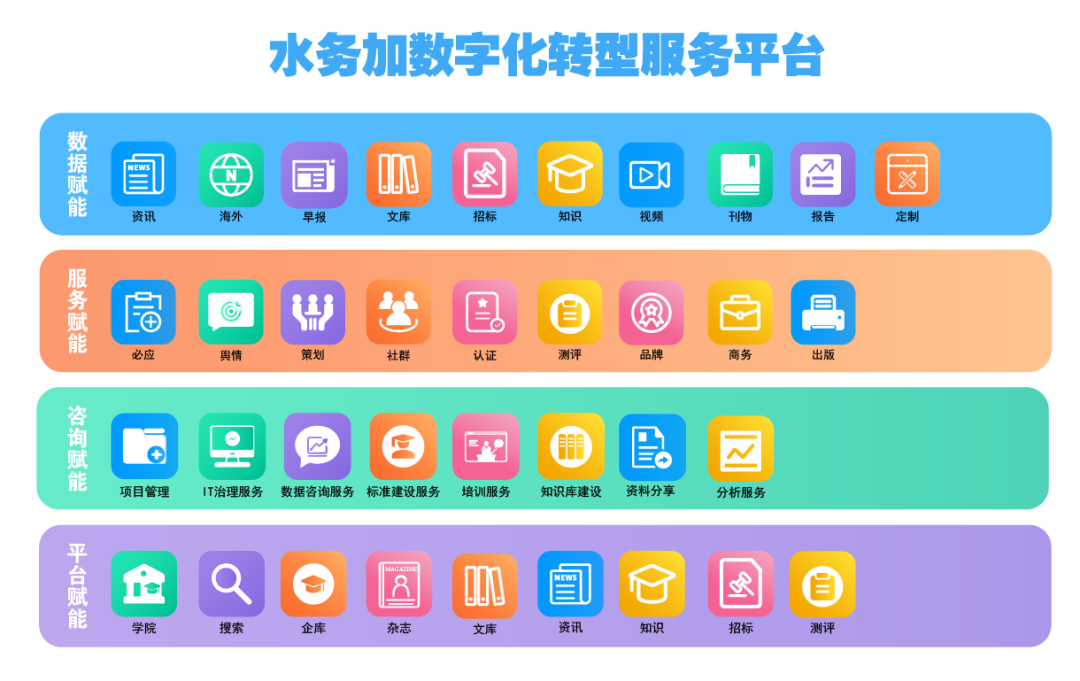 水务加数字化转型服务平台,从4大维度为水务企业赋能 ,涵盖早报、资讯、海外、文库、招标、知识、视频、刊物等 36款产品 ,助力水务企业数字化转型。