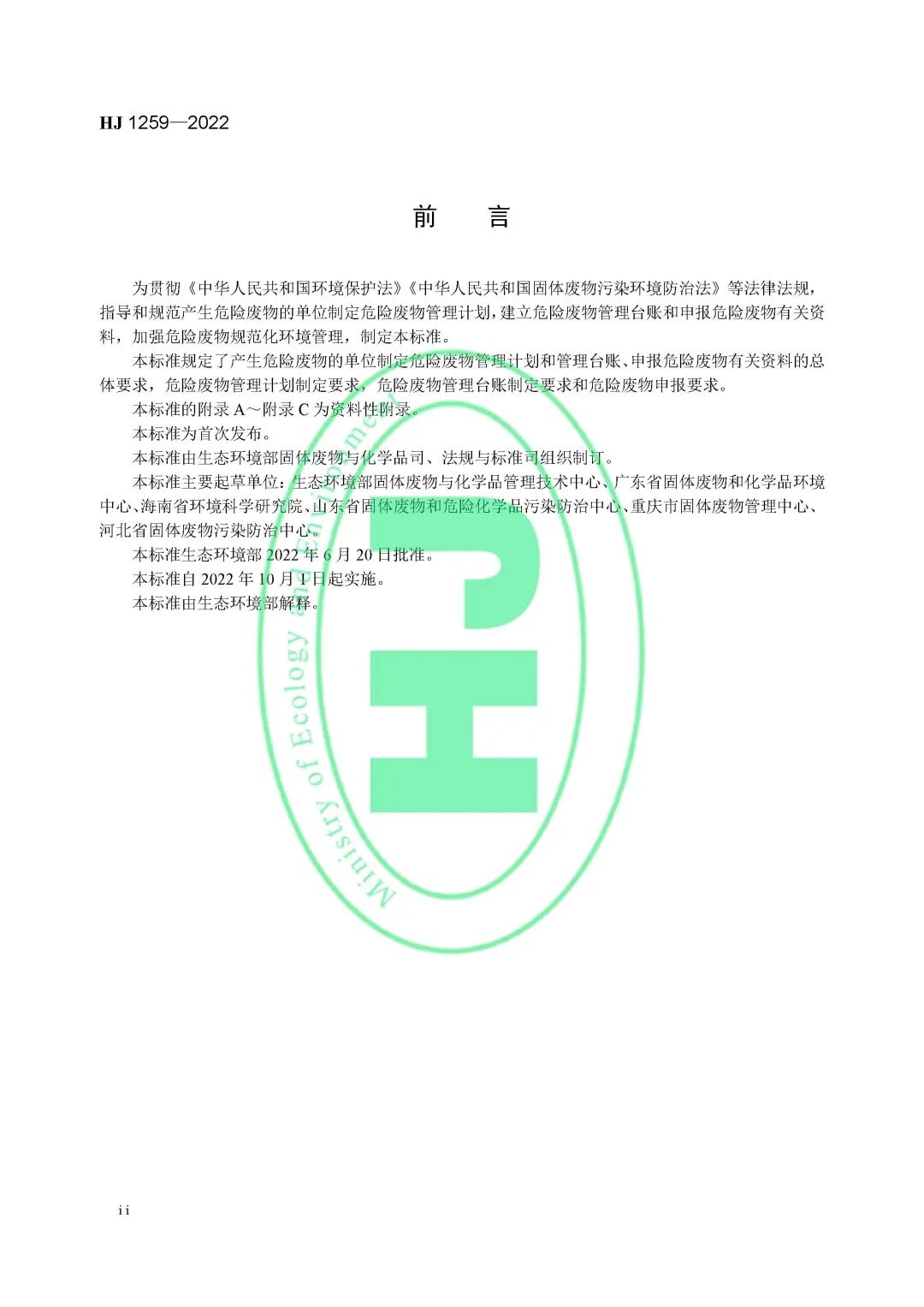 为贯彻《中华人民共和国环境保护法》《中华人民共和国固体废物污染环境防治法》等法律法规,指导和规范产生危险废物的单位制定危险废物管理计划,建立危险废物管理台账和申报危险废物有关资料,加强危险废物规范化环境管理,制定本标准。本标准规定了产生危险废物的单位制定危险废物管理计划和管理台账、申报危险废物有关资料的总体要求,危险废物管理计划制定要求,危险废物管理台账制定要求和危险废物申报要求。本标准的附录 A~附录 C 为资料性附录。本标准为首次发布。