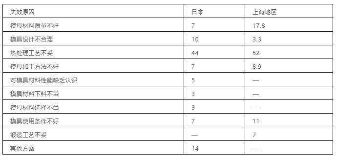这个数据列表说明的是对以往事故的统计结果,在对未来事故的预测上是不适用的。就是说对明天的某个模具失效的原因判定,不能就此认为模具失效的原因热处理占44~52%。而是要针对性的做分析。这个统计数据误导了不少人,让人们形成了一个思维定势:认为模具失效就是热处理问题。希望大家注意这个问题。