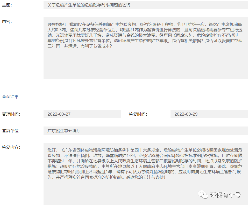 内容 领导您好!我司仅在设备保养期间产生危险废物,经咨询设备工程师,约1年维护一次,每次产生废机油量大约0.3吨。咨询几家危废经营单位后,均是以1吨作为起算价进行算费的,且每次清运均需要派专车进行运输,光运输费用就要好几千块,造成资源与金钱的极大浪费。经查询《固废法》,危险废物贮存不得超过一年的条例是针对危废处置经营单位。请问危废产生单位的贮存年限,是否有相关依据?是否可以妥善贮存两三年再一并清运,有利于节省成本?