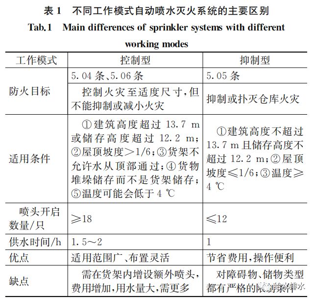 根据“规范”的规定,目前用于仓库的喷头类型主要有标准覆盖面积洒水喷头、早期抑制快速响应喷头和特殊应用喷头,“规范”5.0.4、5.0.5和5.0.6条分别是以这3种喷头为基础确定的设计参数。3种喷头的设计理念和动作性能完全不同,也代表了以这3种喷头为基础的3种系统(见表1)。