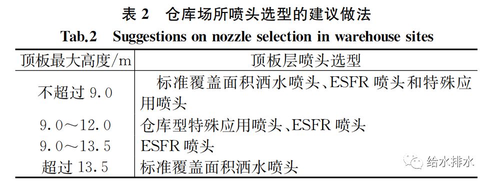 基于上述分析,“规范”对于仓储建筑顶板层喷头的选型建议如表2所示。