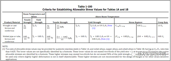 NOTE:(1) Two sets of allowable stress values may be provided for austeniticstainless steels in Table 1A; and nickel alloys, copper alloys, and cobaltalloys in Table 1B; having an SY/ST ratio less than 0.625. The lower values are not specifically identifiedby a footnote. These lower values do not exceed two-thirds Of the yieldstrength at temprature .Thehigher alternativeallowablestresses are identified by a footnote. These higher stresses may exceed two‐thirdsbut do not exceed 90% of the yield strength at temperature. The higher Values should be used only where slightly higherdeformation is not in itself objectionable. These higher stresses are notrecommended for the design of flanges Or for other strain-sensitiveapplications.