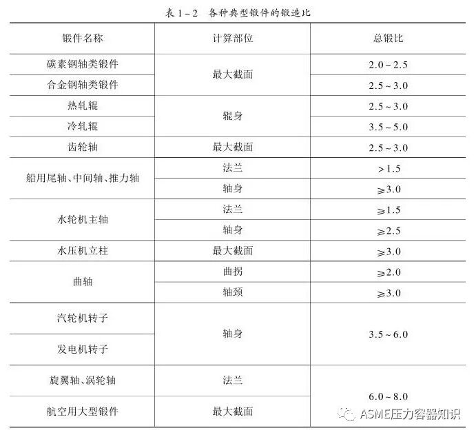为保证锻件质量,简化锻造工序,应根据锻件的用途适当选择锻造比的大小,见表1-2。