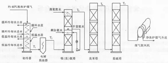 焦炉煤气从炭化室上升管逸出时温度为650~800℃,它的冷却分成两步,先在集气管与桥管中用70~75℃的循环氨水喷洒,使煤气冷到80~85℃,煤气中60%的焦油蒸气被冷凝下来,然后再在煤气初冷器中进一步冷到25~35℃或低于25℃。