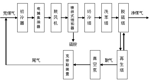 把鼓风机放在系统的最后,将焦炉煤气从-7~-10kPa升压到15~17kPa后送到用户。负压流程适合于水洗氨工艺。