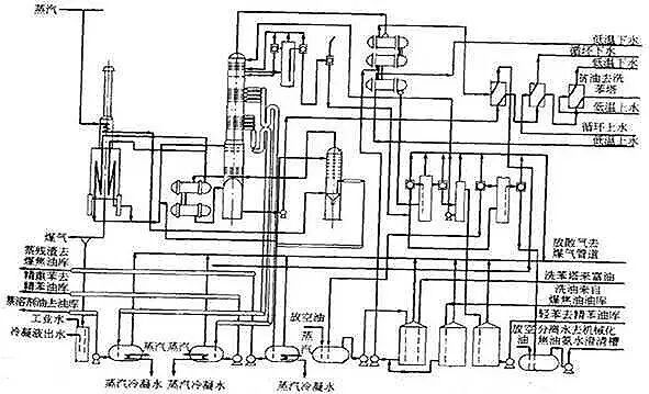 吸收了煤气中苯族烃的洗油成为富油。按照富油加热方式可分为预热器加热富油的脱苯法和管式炉加热富油的脱苯法。前者加热温度较低,不利于蒸馏且消耗的蒸汽量大;后者具有脱苯程度高,蒸汽耗量低,生产污水少等优点。因此现在管式炉加热富油脱苯法是在应用最广泛的方法。