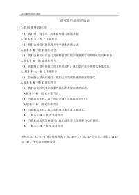 高可靠性组织评估表1-组织领导的反应我们对于每个员工的才能和技巧都很清楚根本不 B.一般 C.非常符合我们会讨论问题以及从中学到东西的方法A.根本不 B.一般 C.非常符合我们会相互讨论自己的独特技能以便知晓谁拥有相关特殊技巧和知识A.根本不 B.一般 C.非常符合在如何正常开展我们的工作活动时,我们会讨论许多替代备选方案。根本不 B.一般 C.非常符合(5)在试图去解决问题时,我们会利用团队成员的独特技巧A.根本不 B.一般 C.非常符合(6)我们会花时间来识别那些我们不希望出错的活动。A根本不 B.一...